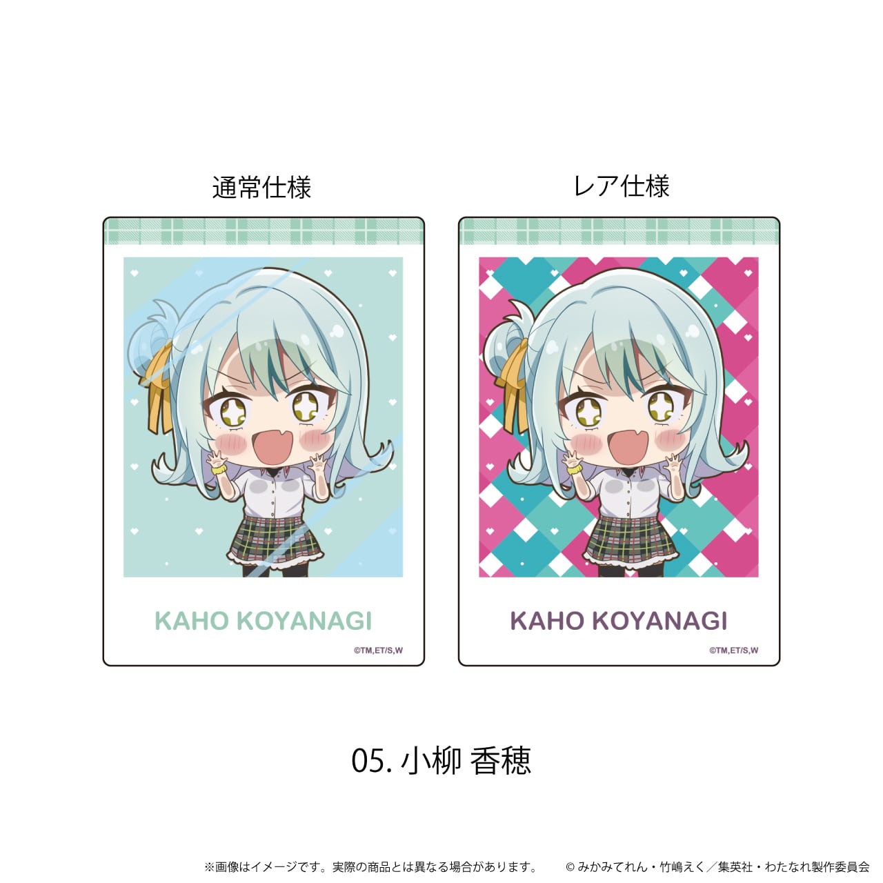 BOX(5枚入り)での販売です。1BOXに通常仕様4枚+レア仕様1枚の5枚が封入され、どのキャラクターがレア仕様かはランダムとなります。